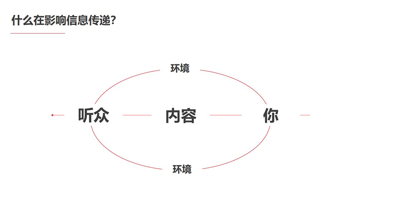 信息传递过程中,共包含四个核心影响因素,分别是环境、听众、你、内容、环境。